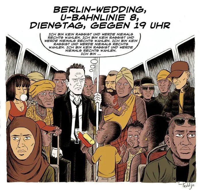Finally, I pull myself together, shake my head at my insane notion of ‘brave German men’ and continue on my way home. Two sleek, young Africans with expensive, wireless Air Pods stroll relaxed on the sidewalk. They know that no one should offend them. A well-dressed African woman, accompanied by her two children, and a veiled Turkish woman with a muscle man stroll down the street. Far and wide there is not a German in sight either.