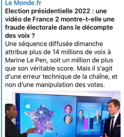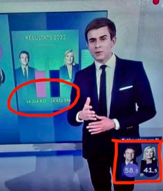 There is growing evidence that the recent French presidential election was a fraudulent election conducted by manipulating broadcasters’ servers. According to a source in France, at 9:18 pm on the 25, when the French presidential election was held, about 89% of the vote counting, if you look at the TV screen by France2, a French public broadcaster, Macron was 14,214,825 (49.6%) and Marine Le Pen was 14,432,396 (50.4%) was obtained.