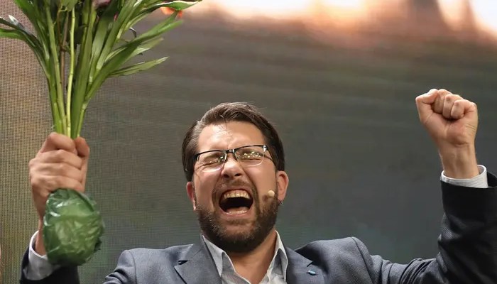 The leader of the Sweden Democrats, Jimmie Åkesson, told a crowd of cheering supporters on Sunday evening: ‘Our goal is to sit in government. Our goal is a majority government. It’s looking pretty damn good now.’