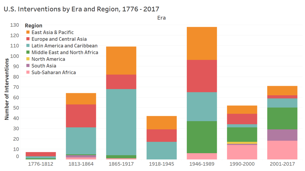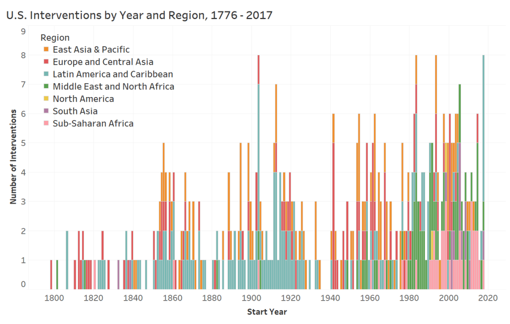 The Military Intervention Project at Tufts University’s Center for Strategic Studies has documented even more foreign meddling. ‘The US has undertaken over 500 international military interventions since 1776, with nearly 60% undertaken between 1950 and 2017,’ the project wrote. ‘What’s more, over one-third of these missions occurred after 1999.’ Document PDF