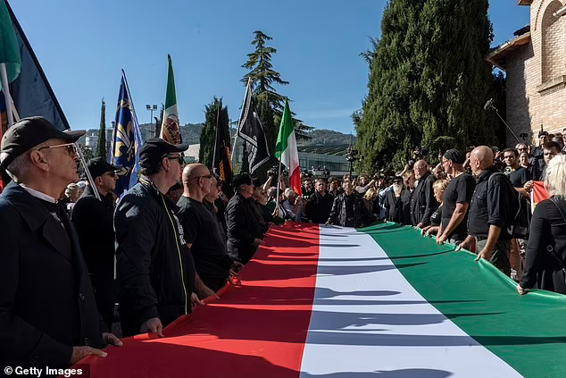Raising their hands in the raised arm open hand peace salute, up to 10,000 Italians sang in praise of Benito Mussolini to mark 100 years since the beginning of his leadership of renaissance 1922-1945 Italy.