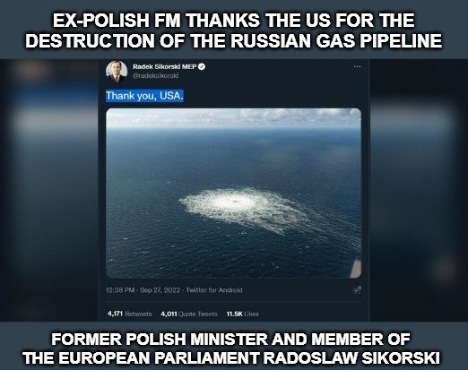 The Kiev and Polish regimes were exultant over the sabotage of Nord Stream II. A former Polish minister was caught out thanking the United States for the sabotage but soon afterwards removed his comment.