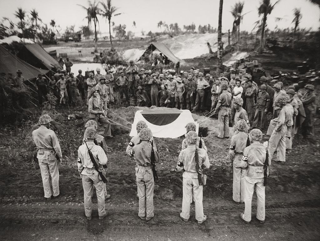 US Marines burying Lieutenant General Yoshitsugu Saito with the Japanese flag on July 10, 1944. Saito fell in the Battle of Saipan, in which he was the highest command of the Japanese Army defending that island. His funeral was presided over by General Holland Smith of the United States Marine Corps (Photo: Universal History Archive).