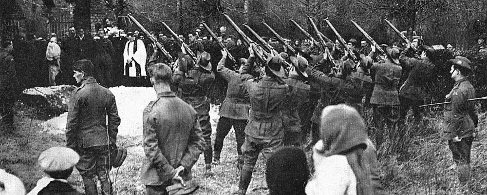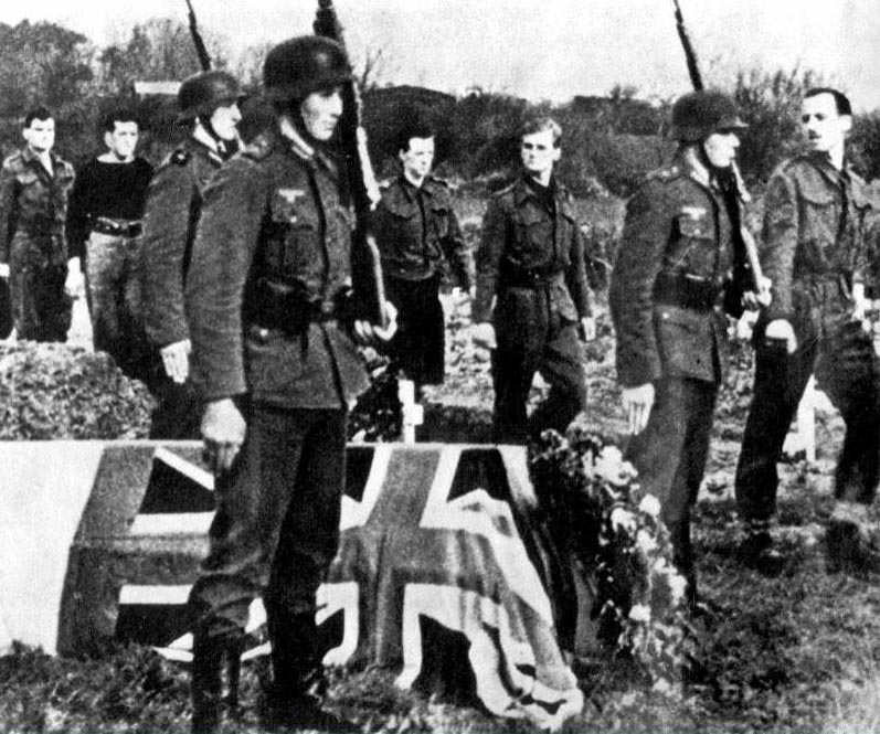 German Luftwaffe servicemen at the burial of two British airmen, Sergeants Butlin and Holden, in Jersey in 1943. Their coffins were draped with British flags. Jersey, like the remaining Channel Islands – located near the French coast – was the only British Crown territory occupied by Germany in World War II.