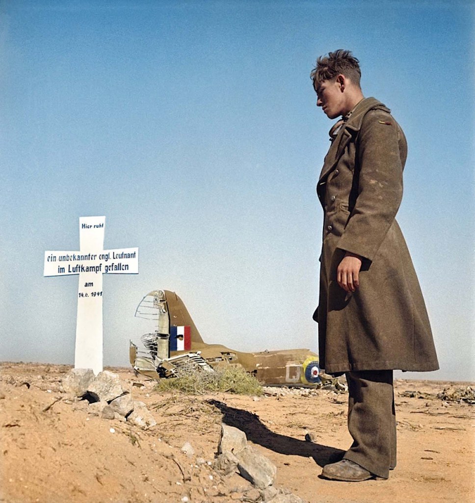 A Luftwaffe aviator observing the grave of a British Lieutenant shot down by the Germans in North Africa on June 14, 1941. The Germans buried him and put that white cross on his grave, right next to the downed plane. The cross reads, in German: “Here lies an unknown English Lieutenant, killed in air combat.”