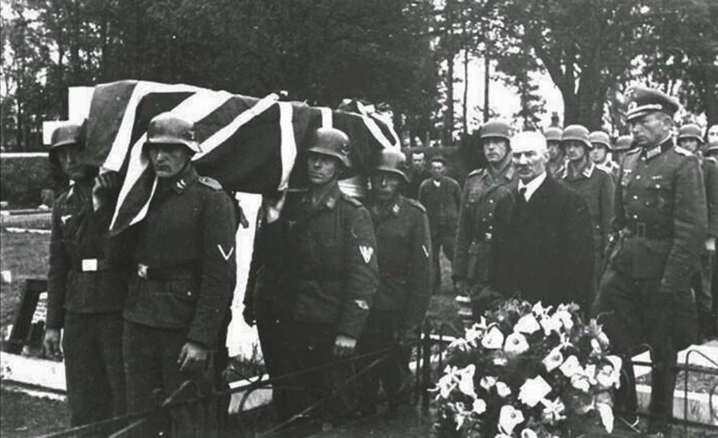 Two German Luftwaffe airmen being herded with honors to Portobello Cemetery, Edinburgh, Scotland, on October 16, 1939, by members of the British Royal Air Force (RAF). The German airmen had been shot down by British fighters. Their coffins were covered with the German war flag of that time, which included the swastika. More than 10,000 people attended this funeral to pay tribute to their fallen enemies (Photo: Edinburgh News).