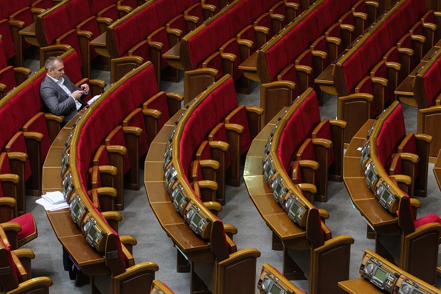 Ukrainian lawmaker sits in an empty parliamentary chamber in Kiev.