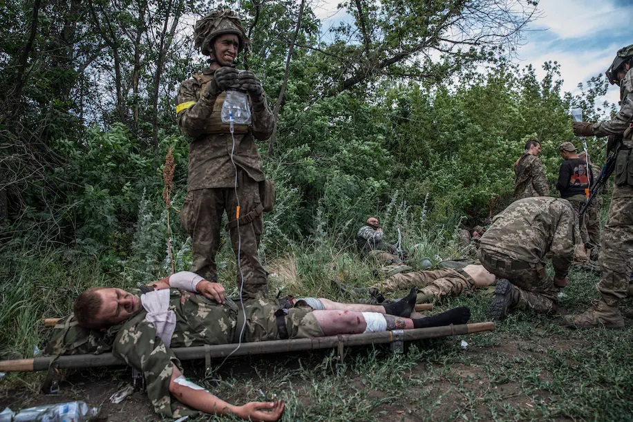 A soldier assists as wounded Ukrainian troops are treated outside a farm village in the eastern Donbas region.