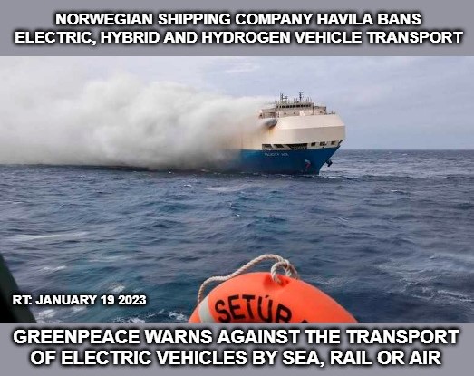 A shipping company in Norway has banned electric, hybrid and hydrogen vehicles from its ferries, according to Junge Freiheit. The fact is that when an electric car ignites, it is almost impossible to put out the fire by rail, ship or aircrew. In February of this year, the Felicity Ace ship sank off the Azores along with thousands of electric cars and Porsche or Bentley cars on board.