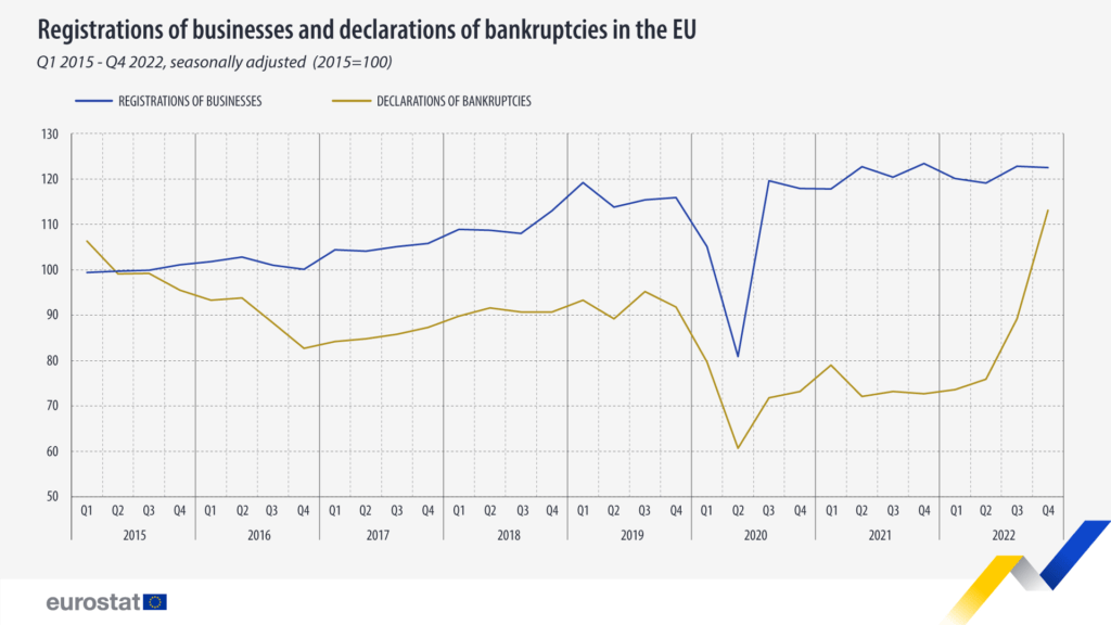 The number of bankruptcies across the European Union rose to record levels in the fourth quarter of last year, as soaring energy bills and high inflation led to insolvency for thousands of businesses.