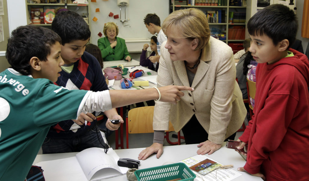 Former German Chancellor Angela Merkel talks with students during a visit to the Erika-Mann-Primary school in Berlin, Germany, in a photo dated Oct. 20, 2011. Merkel is generally seen as responsible for a dramatic shift in Germany’s immigration policy.