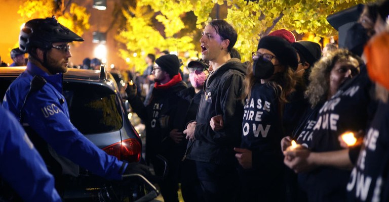 Demonstrators demanding a ceasefire in Israel’s military onslaught against the Palestinian population gathered on Wednesday night outside the DNC offices, where lawmakers were holding a meeting. The activists blocked police from getting to the doorway.