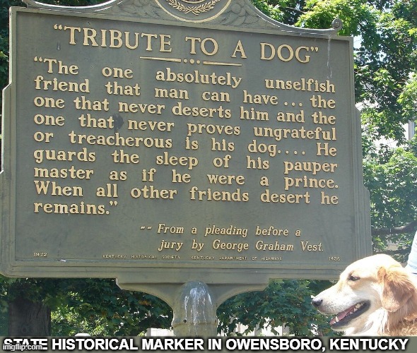 If fortune drives the master forth an outcast in the world, friendless and homeless, the faithful dog asks no higher privilege than that of accompanying him to guard against danger, to fight against his enemies, and when the last scene of all comes, and death takes the master in its embrace and his body is laid away in the cold ground, no matter if all other friends pursue their way, there by his graveside will the noble dog be found, his head between his paws, his eyes sad but open in alert watchfulness, faithful and true even to death.