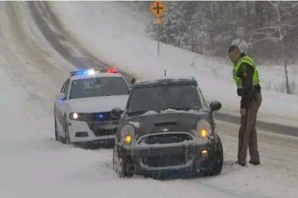 The car’s speedometer was showing 20-30-40 and then 50 MPH, but it was still stuck in the snow and its wheels uselessly spinning. Trooper Nixon, having a sense of humor, began running in place next to the speeding (but stationary) car.