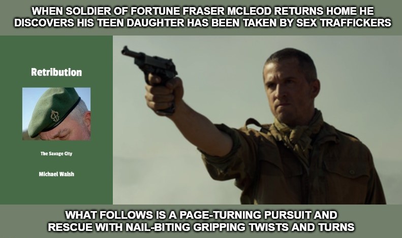 RETRIBUTION – MICHAEL WALSH: Set in Liverpool the novel provides a gripping account of an ex-mercenary turned international arms dealer who on returning to his roots discovers that his adolescent daughter has been enticed into a lifestyle that can only end up with her as a drug-dependent sex worker.