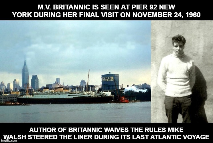 BRITANNIC WAIVES THE RULES The last White Star Liner (1845-1960) by Michael Walsh, regular television, radio and newspaper personality. In 68 lavishly illustrated stories the company’s last deckboy vividly recalls shipboard life. The liner’s colourful characters and jaw-dropping incidents both on board and in New York’s notorious Hell’s Kitchen. A unique collector’s item. LINK TO BOOK https://tinyurl.com/42zns8n2