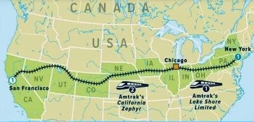 The rail route from San Francisco to New York is one of the longest and most scenic railroad tracks in the United States, traversing many landscapes and regions?