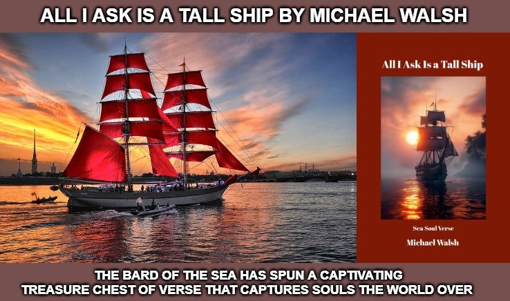 ALL I ASK IS A TALL SHIP Hauntingly illustrated a captivating chronicle of life penned by a son of the seven seas evoked from worldwide voyages during the 1950s and 1960s. The Bard of the Sea has spun a captivating treasure chest of delightful verse that captures hearts and souls worldwide. LINKS TO BOOK → LULU.COM AMAZON.CO.UK