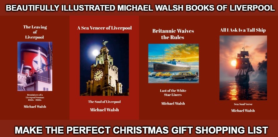 A SEA VENEER OF LIVERPOOL Michael Walsh republishes his 1998 best-selling collection of lyrical tributes to the extraordinary ordinary people of Liverpool. Their talent poured from little terraced homes and took the world by storm. In one illustrated volume the Bard of Liverpool raises the nostalgic parting glass to a disappearing age. LINK TO BOOK → LULU.COM AMAZON.CO.UK
