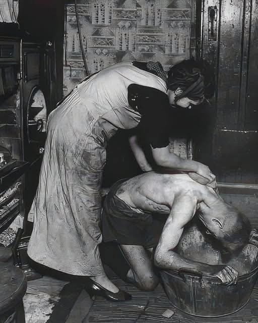 This photograph not only portrays the physical toll of coal mining but also highlights the importance of cleanliness and care within the home.
