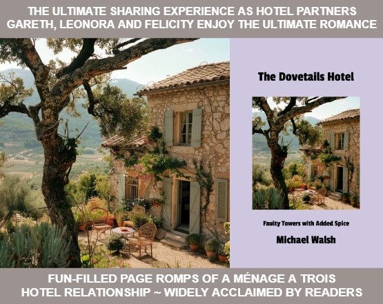 THE DOVETAILS HOTEL A charming romantic and risqué comedy that dares to discover the taboo pleasures of a ménage a trois relationship. Michael Walsh award-winning novelist amusingly reveals the amorous love lives of Gareth and his two attractive lady friends who are happy to share more than just friendship with the debonair novelist. LINK TO BOOK → LULU.COM AMAZON.CO.UK