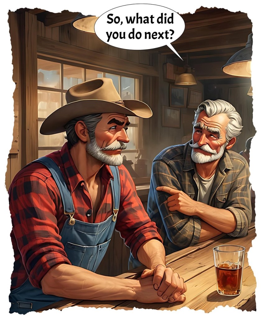 ‘Well,’ the farmer said, ‘I didn’t have any more rope, so I took off my belt and tied her tail to the rafter. But as I was tying it, my pants fell down… and that’s when my wife walked in.’