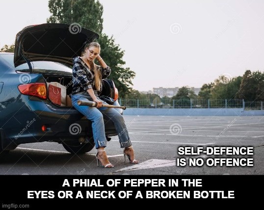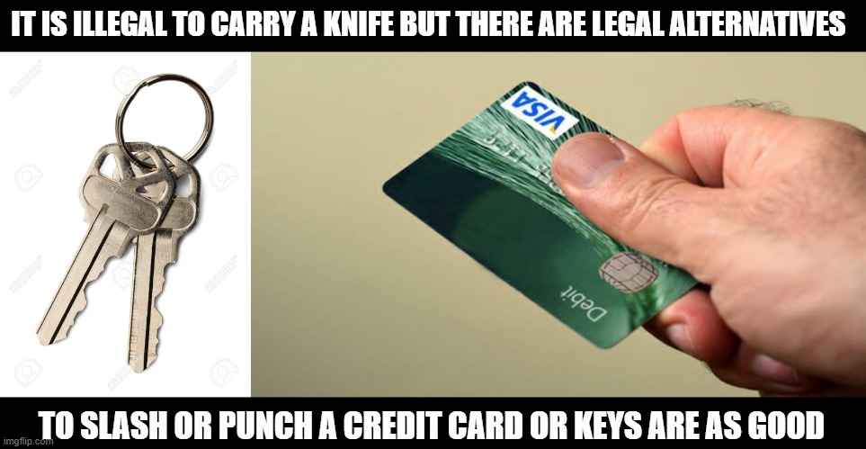 In her purse or pockets, a woman has a bunch of keys. Used as a knuckle-duster-cum-gouger there is no more terrifying weapon. A woman also has her debit/credit card.