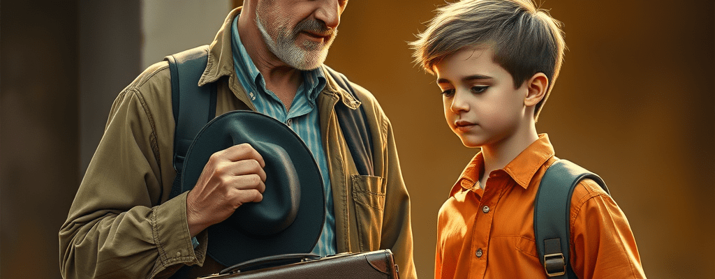 The small, poignant detail of the father holding not only his own hat but his son’s as well, suggests a tight grip on the last moments of shared time.