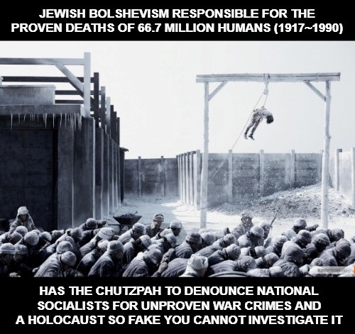 ‘’Without Jews, there would never have been Bolshevism. For a Jew, nothing is more insulting than the truth. The bloodthirsty Jewish terrorists have murdered more than sixty-million people in Russia from 1918 to 1957.’ ~ Aleksandr Solzhenitsyn, Nobel Peace Prize winner and Patriot.