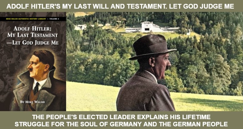 MY LAST TESTAMENT. LET GOD JUDGE ME. Mike Walsh. Forbidden History: This is the first time this best-seller has been published. Hitler describes his struggle for victory over the Capitalist-Communist hydra. Adolf Hitler also explains his downfall. Illustrated. Softcover. 195 pages. https://barnesreview.org/product/adolf-hitler-my-last-testament-let-god-judge-me/