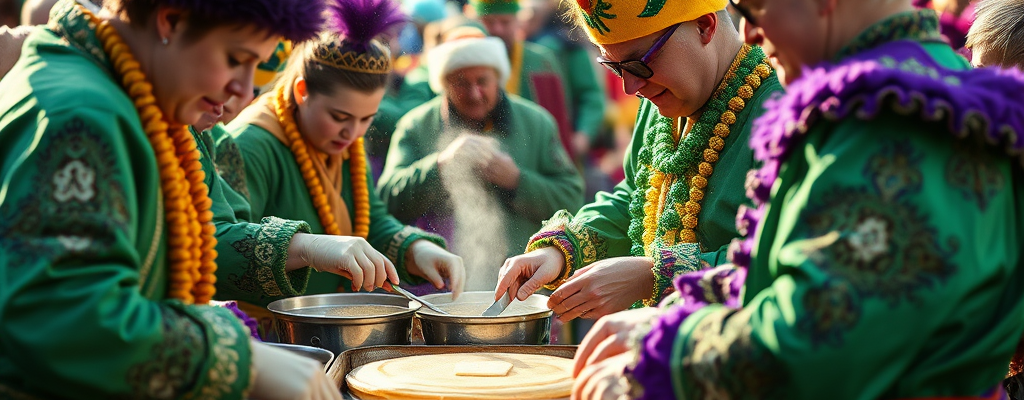 During Carnival, a king cake is prepared. The treat includes a baby figurine, symbolizing Jesus. Whoever gets it is expected to host the next party or treat everyone else to a new cake. Specifically, on Tuesday, pancakes are eaten.