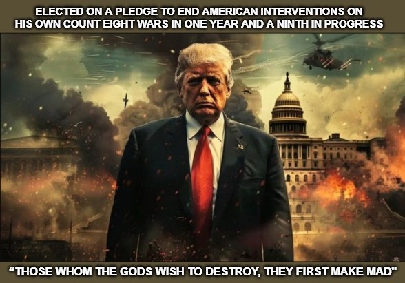 It seems to be targeting missile sites, but Trump says it is to stoke regime change. A war without focus is a war with no tangible goals. And a war with no goals ends up a Forever War.”