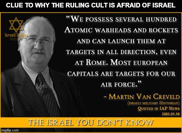 “We possess several hundred atomic warheads and rockets and can launch them at targets in all directions, even at Rome. Most Europeans are targets for our air force.” Martin van Creveld. Israeli Military Historian. Quoted in IAP News, 2003. 05. 30.