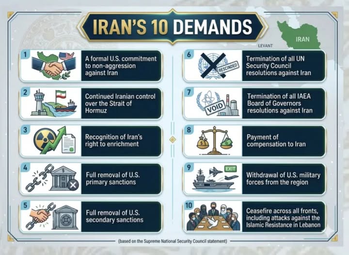 The termination of UN Security Council and IAEA resolutions, the payment of war reparations, withdrawal of US combat forces from the region, as well as a halt to the war on all fronts, including against the Islamic Resistance in Lebanon.