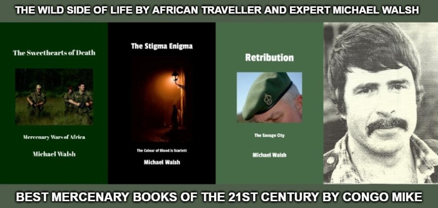 NOTORIOUS DOGS OF WAR. Legendary mercenary true story bestsellers by African veteran Michael Walsh, who wears the tee-shirt: SWEETHEARTS OF DEATH, THE STIGMA ENIGMA and RETRIBUTION. https://michaelwalshbooks.wordpress.com/